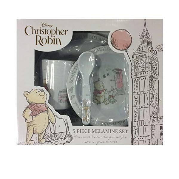 Reisen des ganzen Weg von dem Hundertmorgenwald Abendessen zu sitzen und essen mit Sie Pu und Ferkel sind. Machen Sie Mahlzeiten besonders speziell mit diesem 5-teiligen Melamin Geschirr, komplett mit schönen Original-Illustrationen von Pu und Ferkel auf ihre Abenteuer zu erkunden berühmten Londoner Sehenswürdigkeiten und ein paar weise Worte von Winnie selbst. Dieses herrliche Besteckset bringt wirklich AA Milne zeitlose Charaktere zum Leben!