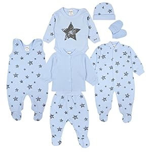 Entzückendes Baby Bekleidungsset sowohl für Mädchen als auch Jungs. Besteht aus 7 Teilen: Strampelhose mit Fuß, Langarmbody, Strampler, Babyjäckchen, Schlafstrampler, Mütze, Kratzfäustlinge