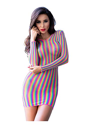 Auffälliges Minikleid aus elastischem Netzmaterial mit regenbogenfarbenen, vertikalen Streifen, die Ihrer Figur schmeicheln.
