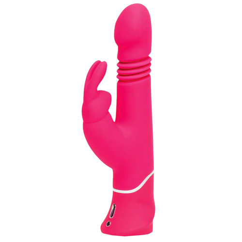 Rabbitvibrator mit Klitorisreizarm in Hasenform mit beweglichen Ohren und Stoßfunktion. 2 Motoren, je einer in Schaft und Klitorisreizarm für 3 Stoßgeschwindigkeiten im Schaft und 9 Vibrationsmodi im Klitorisreizarm. Mit Reisesperre. Wiederaufladbar mit beiliegendem USB-Ladekabel. Pink. Gesamtlänge 22,7 cm, Ø 3,4-3,9 cm. Silikon mit PU-Beschichtung, phthalatfrei gemäß EU-Verordnung 1907/2006/EC.