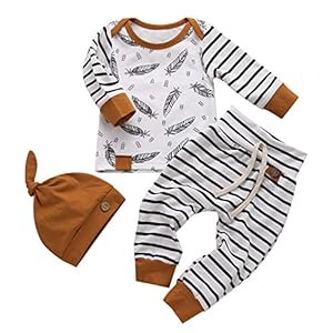 De feuilles Baby 3pcs Bekleidungssets Unisex Kinder Kleidungssets Mütze Feder Druck Langarmshirts Streifen Hosen