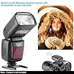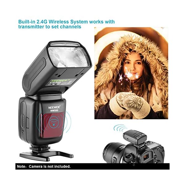 2.4G Funk System: Ausgestattet mit eingebautem 2.4G Funksignal; Wird mit einem Sender mit 15 Kanälen und einem Betriebsbereich von 30 Metern geliefert, um die Funk Auslösefunktion zu unterstützen (Hinweis: Batterie für den Blitz ist nicht enthalten; Batterie für Sender ist enthalten)
