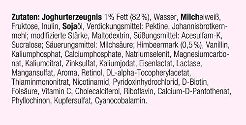 JOGHURTERZEUGNIS MIT 1% FETT (84%), MIlCHEIWEIß, Wasser, Ananassaft aus Ananassaftkonzentrat (3,5%), Fruktosesirup, Inulin, SOJAÖL, Kokosnusscreme (0,1%), Verdickungsmittel: Johannisbrotkernmejl, Pektin. modifizierte Stärkemehl, Maltodextrin, Süßungsmittel: Natriumclycamat, Süßstoff-Sodium, Acesulfam-Kalium, Sucralose. Säureregulator: Citronensäure, Natriumcitrat. färbendes Lebensmittel Saflorkonzentrat, Kaliumdihydrogenphosphat, Natriumselenit, Magnesiumcarbonat, Kaliumhydroxid, Kaliumcitrat, Zinksulfat, Kaliumiodid, Eisenlactat, Lactase, Mangansulfat, Würzessenz, Vitamin A, DL-alpha-Tocopherylacetat, Thiaminmononitrat, Nicotinamid, Pyridoxinhydrochlorid, D-Vitamin H, Folsäure, Vitamin C, Cholecalciferol, Riboflavin, Calcium-D-Pantothenat.