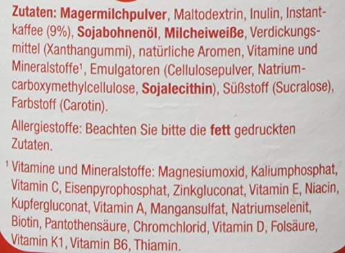 Zutaten: Magermilchpulver, Maltodextrin, Inulin, Instantkaffee (9 %), Sojabohnenöl, Milcheiweiße, Verdickungsmittel (Xanthangummi), natürliche Aromen, Vitamine und Mineralstoffe¹, Emulgatoren (Cellulosepulver, Natriumcarboxymethylcellulose, Sojalecithin), Süßstoff (Sucralose), Farbstoffteilchen (Carotin). ¹Vitamine und Mineralstoffe: Kaliumphosphat, Magnesiumoxid, Eisenpyrophosphat, Zinkgluconat, Vitamin Kohlenstoff, Vitamin E, PP-Faktor, Kupfergluconat, Vitamin A, Mangansulfat, Natriumselenit, Vitamin D, Folsäure, Vitamin B6, Vitamin B1.
