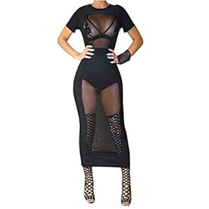 Zeagoo Damen Sexy Bodycon Kurzsam Kleid Lang Partykleider Mesh Patchwork Durchsitig Clubwear
