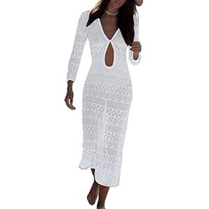 ZIYYOOHY Damen Sexy Strandkleid Stricken Spitze Maxikleid Sommerkleid Lace Bikini Kleid Strandponcho Mit Trompetenärmel…