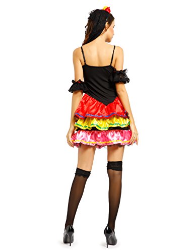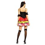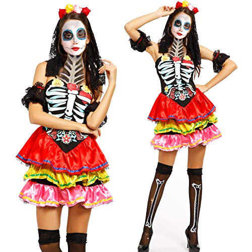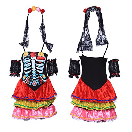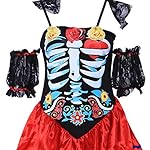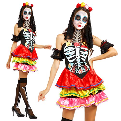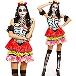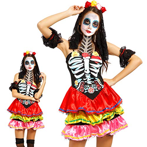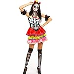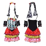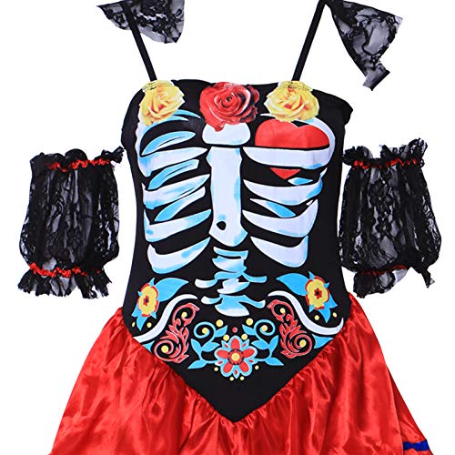 Das Skelett Damenkostuem besteht aus einem kurzen schwarz-Rot Kleid mit Tutu, Haarreif und ein Paar Handschuhe.