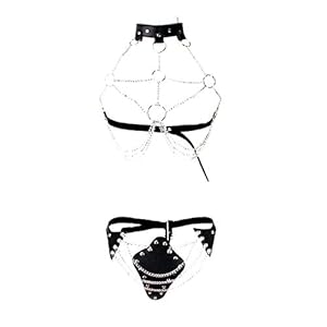 ASEOK Frauen Sexy Body Harness Leder und Metallkette Cupless BH Vest und G-String Bikini-Kostüm Dessous, Damen Body Sexy…