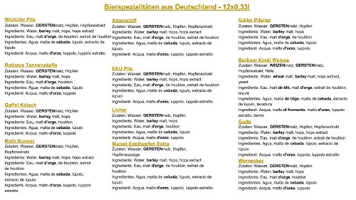 ???? Inhalt: Geschenkkarton mit den 12 besten Bieren aus Deutschland (Bierspezialitäten aus Deutschland) 12 Deutsche Bier Spezialitäten ++ hochwertiger Informationbroschüre über die enthaltenen Bieren ++ Tasting-Anleitung ++ Brauereigeschenke ++ Geschenkverpackung/Geschenkkarton. Also Ideal zum verschenken.