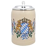 Diesen Steinkrug ziert das bayrische Wappen umrandet von den bayerischen Löwen, dem Wappentier des Freistaates Die Krone auf dem Wappen zeugt von königlicher Abstammung.