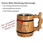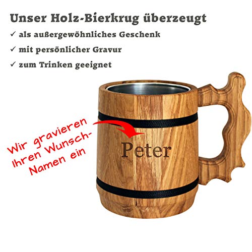 Personalisierter Bierkrug – hochwertiger Holzkrug graviert mit dem Namen Ihrer Kür! Ein beliebtes Geschenk für Papa, Opa, Kumpel & beste Freunde. Als Biergeschenk und Vatertagsgeschenk ist der personalisierte Bierkrug unschlagbar.