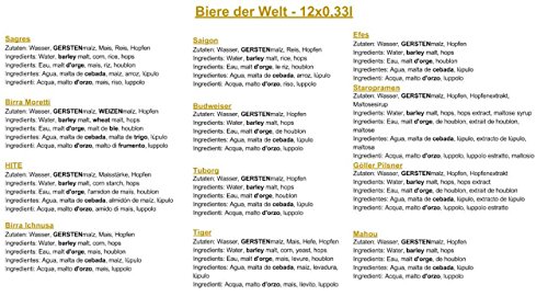 ???? Mögliche Biere: Tiger, Mahou, Hite, Birra Moretti, Tsingtao, Chang, Saigon, Asahi, Cobra, Quilmes, Sagres, Mexicali, Tuborg Alt, Effes, Moosehead, Cusquena, Namaste uvm.