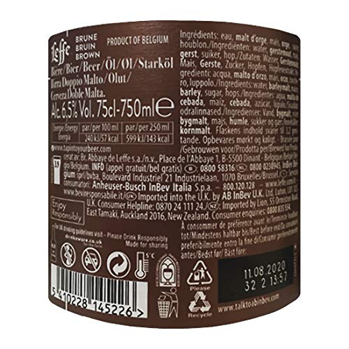 Leffe Brune enthält 6,5 % Alkohol und wird am besten bei 5-6 °C in einem Bierkelch serviert – idealerweise in dem Original Leffe-Kelch, in dem alle Geschmacksnoten zur Geltung kommen.